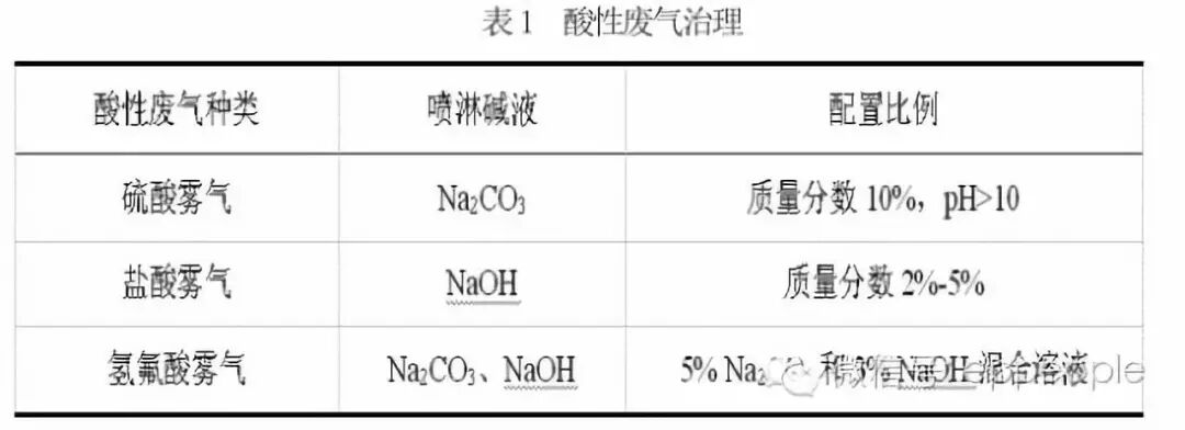 酸性廢氣的治理中,其中酸性廢氣凈化的主要方法是將酸性廢氣用三級堿液噴淋,再有煙囪排放。如處理典型酸往廢氣所配置的堿液如表1所示。用該方法吸收酸性廢氣時(shí),在真空抽氣栗上安裝密閉罩,將車間內(nèi)氣體排放,進(jìn)入裝有填料的噴淋塔。該工藝去除酸性廢氣的效率可達(dá)90%以上。